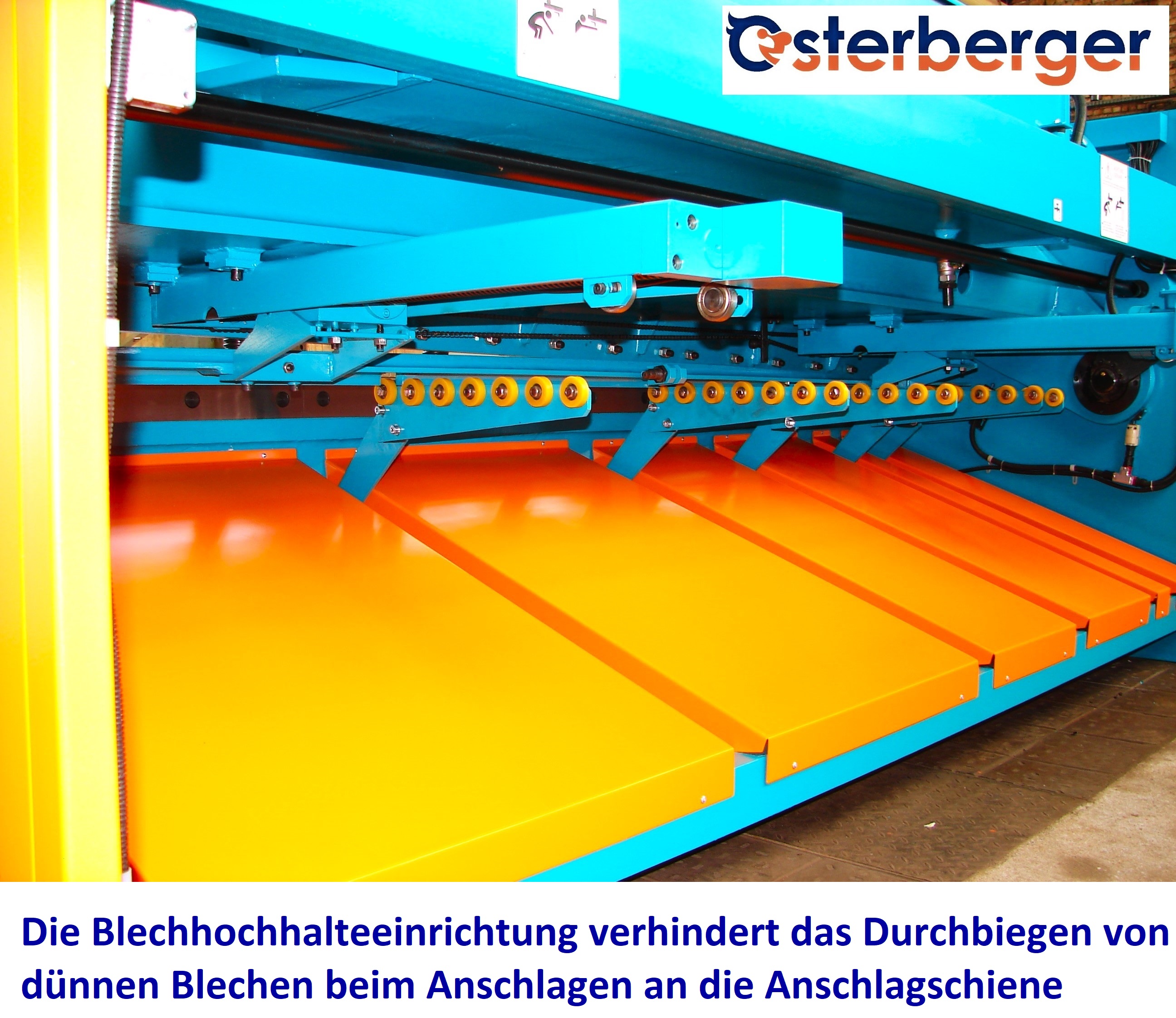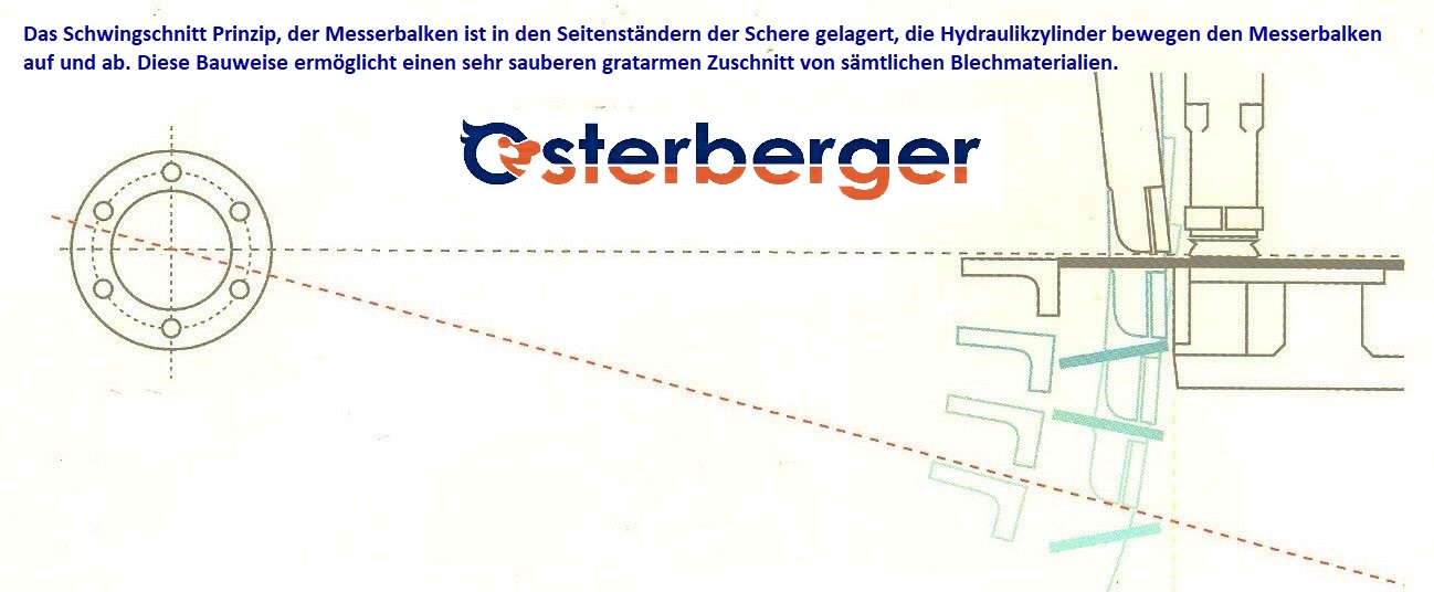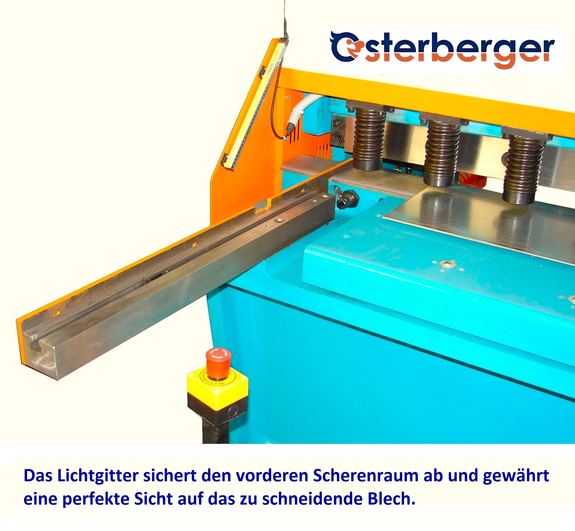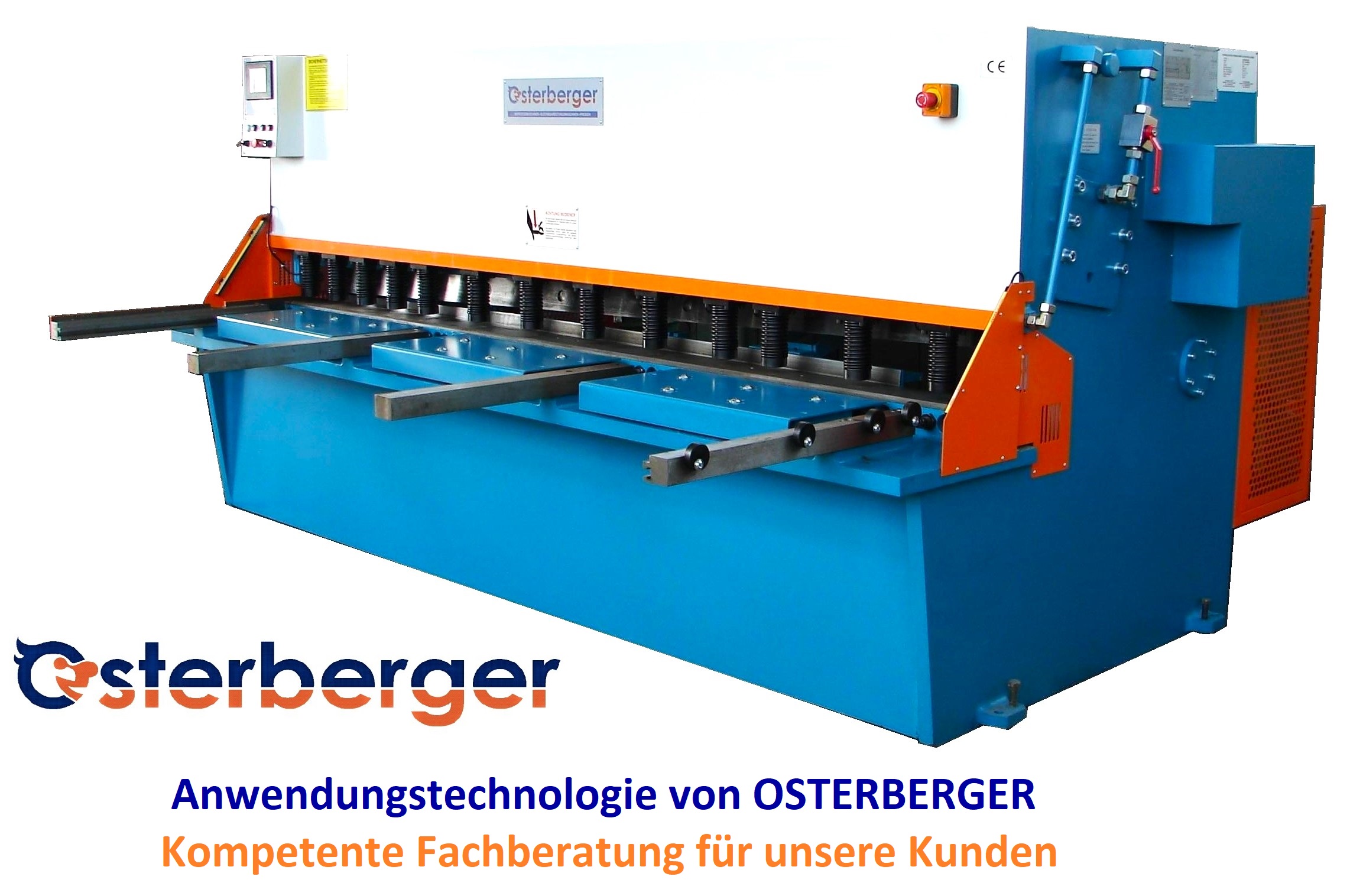 OSTERBERGER – hydraulische Blechtafelschere in Schwingschnitt- Bauweise – Modellreihe SBT, NC – gesteuert (dann mit manueller Schnittspaltverstellung) oder CNC – gesteuert (CNC – gesteuerte, motorische Schnittspaltverstellung) lieferbar. Größte Schneidlänge - 3.200 mm, größte Schneidleistung Stahlblech S235JR – 8 mm. Schnittwinkel 1,5° - Ausladung in den Seitenständern 140 mm – Tischhöhe zirka 800 mm. Hinteranschlag Verstellbereich 800 mm. Antriebsleistung 11 kW, Gewicht zirka 6.500 kg. Optional lieferbar: Blechhochhalteeinrichtung für die Abstützung von Blechen bis 3 mm Blechstärke, Schnittraumüberwachung durch ein Lichtgitter – für eine perfekte Sicht auf das Blech (z.B. für das Schneiden auf Anriss).