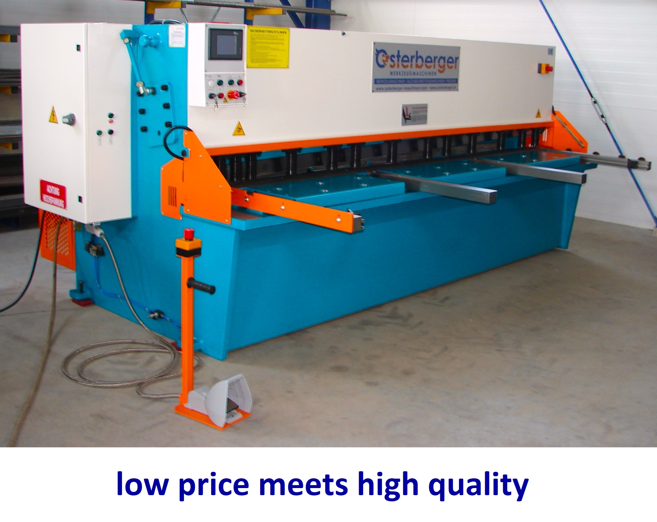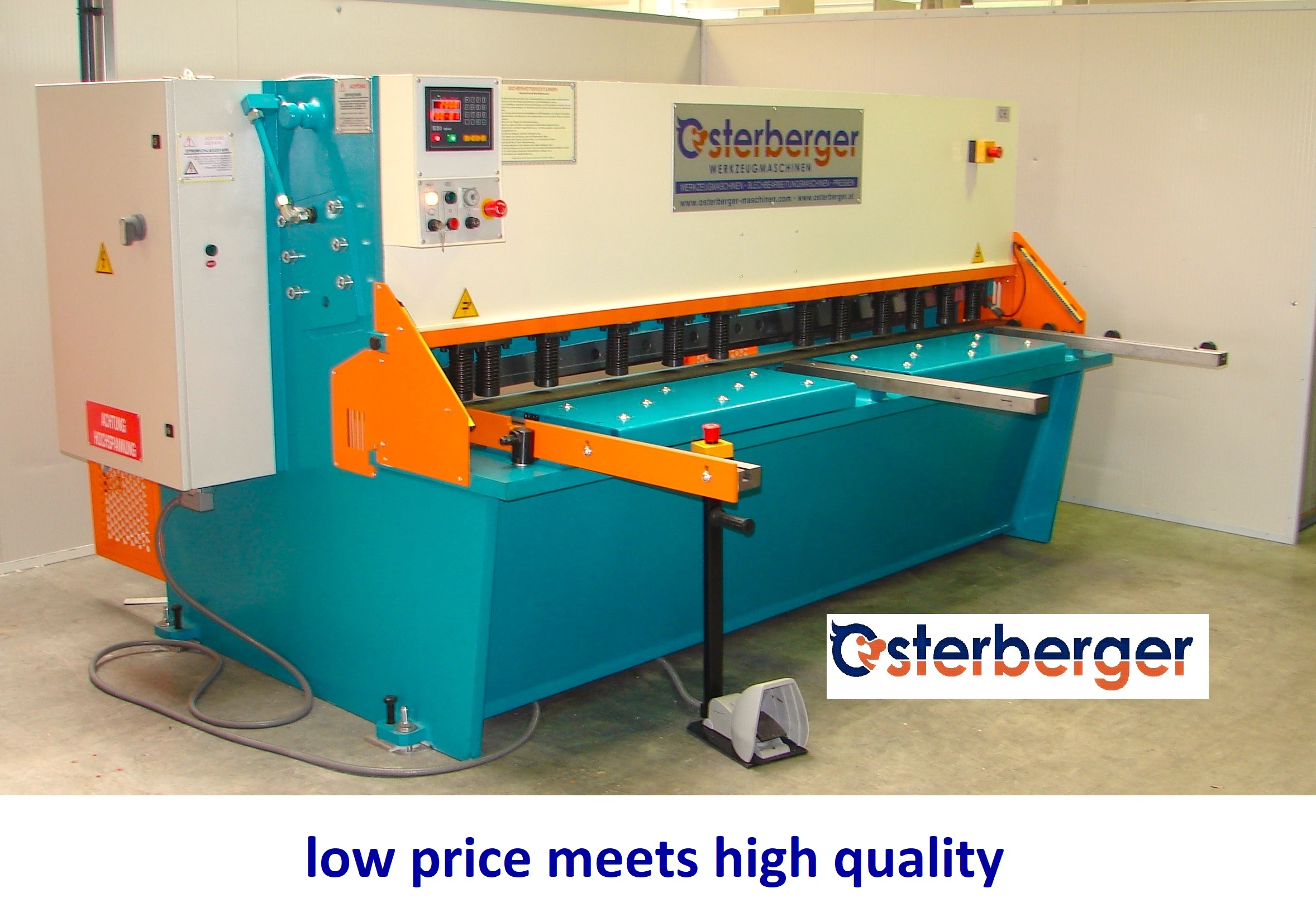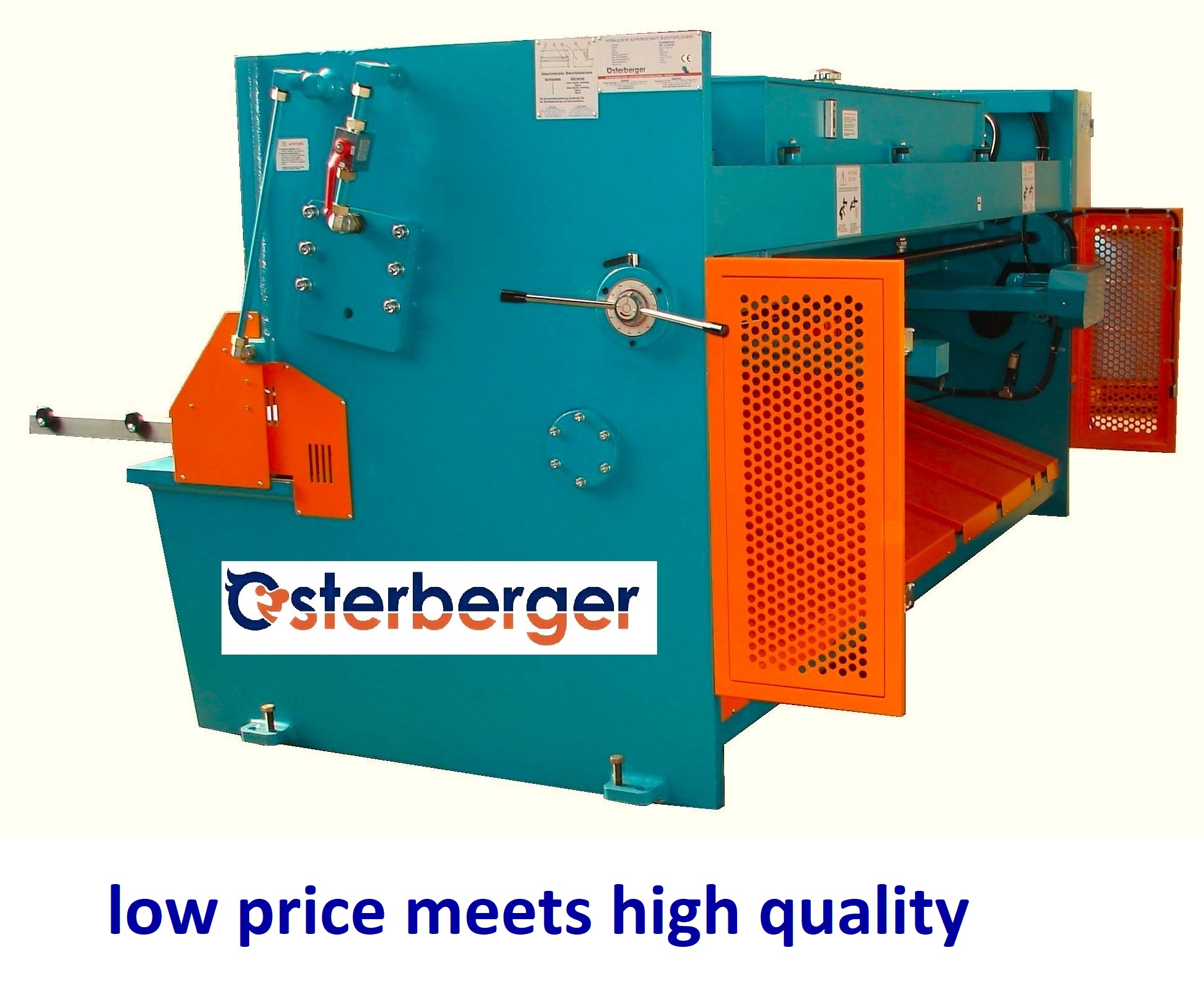 OSTERBERGER – hydraulische Blechtafelschere in Schwingschnitt- Bauweise – Modellreihe SBT, NC – gesteuert (dann mit manueller Schnittspaltverstellung) oder CNC – gesteuert (CNC – gesteuerte, motorische Schnittspaltverstellung) lieferbar. Größte Schneidlänge - 3.200 mm, größte Schneidleistung Stahlblech S235JR – 8 mm. Schnittwinkel 1,5° - Ausladung in den Seitenständern 140 mm – Tischhöhe zirka 800 mm. Hinteranschlag Verstellbereich 800 mm. Antriebsleistung 11 kW, Gewicht zirka 6.500 kg. Optional lieferbar: Blechhochhalteeinrichtung für die Abstützung von Blechen bis 3 mm Blechstärke, Schnittraumüberwachung durch ein Lichtgitter – für eine perfekte Sicht auf das Blech (z.B. für das Schneiden auf Anriss).
