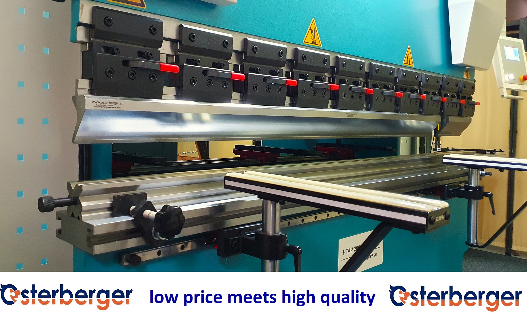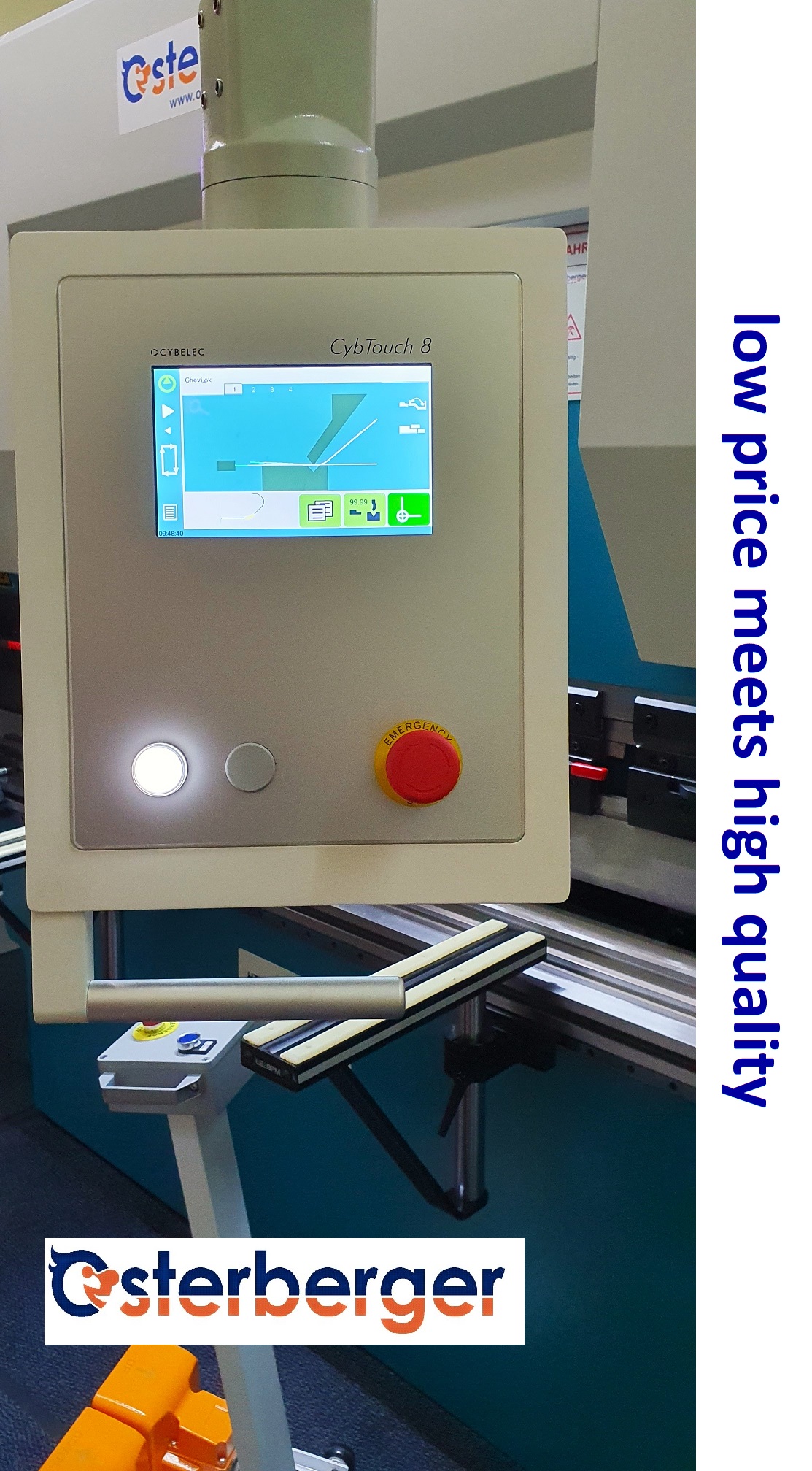 Hydraulische drei Achsen CNC – gesteuerte Abkantpressen HTAP.Servo mit CYBELEC CNC – Steuerung. CybTouch8 mit automatischer Biegewinkelberechnung - Biegefolgenberechnung und Farbgrafik. Maximale Presskraft 630 kN, größte Abkantlänge 2 m / 2,5 m / 3,2 m - Durchgang zwischen den Seitenständern 1.580 mm / 2.080 mm / 2.700 mm, Ausladung in den Seitenständern 250 mm, Pressbalkenhubbereich 100 mm – größtmögliche Einbauhöhe 320 mm, Pressbalken- Fahrgeschwindigkeiten Abwärts 50 /6 mm/Sek. - aufwärts 60 mm/Sek. Tischbreite 160 mm. Zwei Achsen präzisions- Hinteranschlag - Verstellbereich 500 mm – R – Achse 90 mm – Anschlagfinger gleiten auf doppelten Linearführungen. Öltankinhalt 120 Liter. Abmessungen zirka 2,6 / 3,1 / 3,6 m x 1,5 m x Höhe 2,4 m, Antriebleistung 5,5 kW, Gewicht zirka 4,8 / 5,5 / 6 Tonnen. Ausstattung: Matrizenblock, Rehfuß- Biegestempel, Oberwerkzeug- Schnellwechselsystem, Zwei Auflagearme auf Linearführungen, Biegeraumbeleuchtung.