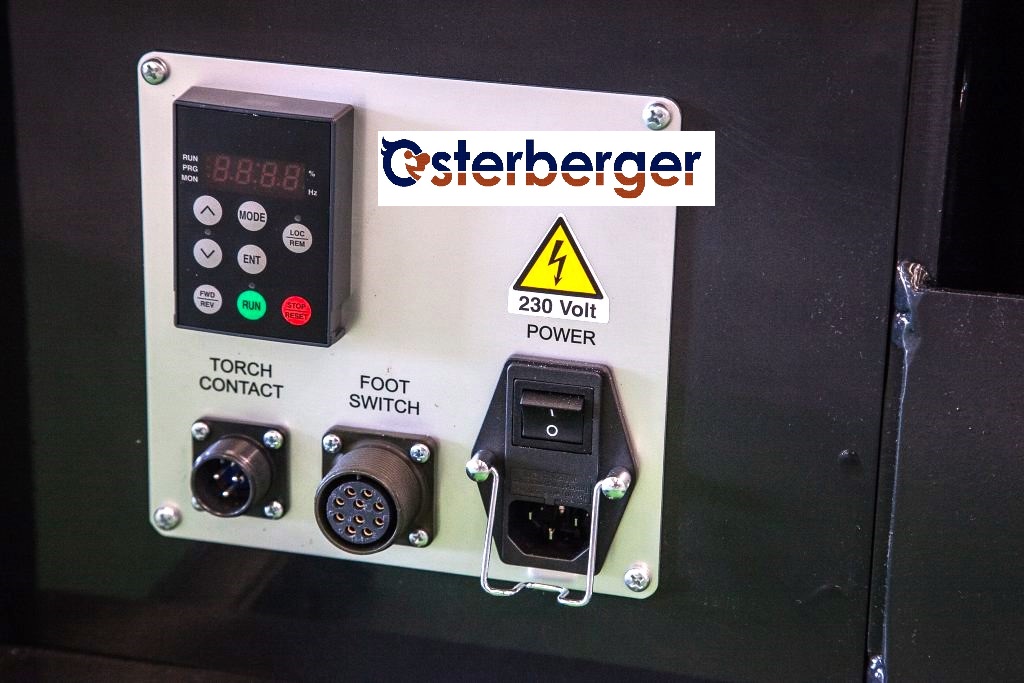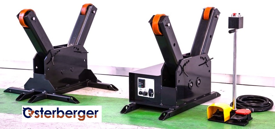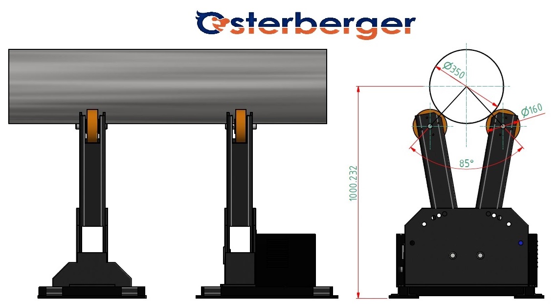RBD2500Universal – qualitativ sehr hochwertige premium Drehvorrichtungsgarnitur in Scherenbauweise für zylindrische Werkstücke, wie Rohre, Wellen, Behälter und andere rotationssymmetrische Werkstücke (zum Beispiel Blechmäntel), maximale Tragkraft der Drehvorrichtung – angetriebene- + nicht angetriebene Einheit 2.500 kg (optional auch mit 3.000 kg Tragkraft lieferbar). Breitenverstellung der Laufrollen manuell - Sicherung durch Steckbolzen, drehbarer Werkstückdurchmesser von Ø 80 mm bis Ø 3.200 mm, stufenlos regulierbare (Basisdrehzahl programmierbar für eine optimale Anpassung an die Schweißaufgabe) Drehgeschwindigkeit 100 mm/min bis 1.300 mm/min durch ein Potentiometer am Bedienpult regelbar, Rollengröße Ø 160 mm x Breite 50 mm – Laufrollen mit PU – Ummantelung oder wahlweise blanker Stahl, Antriebsleistung 0,18 kW, Gewicht der Kesselrollenbockgarnitur 300 kg. Ausstattung: Doppelfußpedal für den Links- und Rechtslauf mit Handbedienteil.